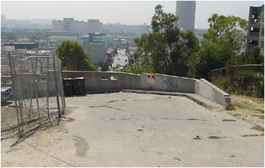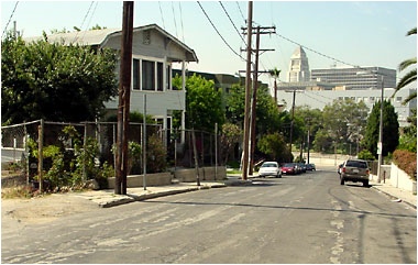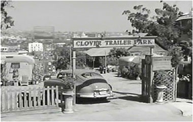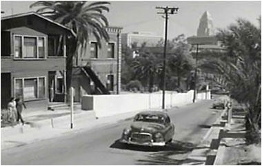 Powell and Richard Erdman drive up Hill Place to the Clover Trailer Park. The area is north of City Hall and was not part of the Bunker Hill redevelopment. The seedy trailer court was real and is an example of what was available for noir directors in the early 1950s. Notice in the background behind the trailer court is the ever present gas works. The photos below were taken in 2008. The house still stands but the trailer court is now a vacant lot.