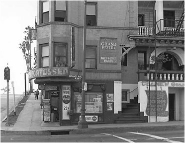 The Grand Hotel featured prominently in the film. The hotel was on the corner of Third and Grand with a delicatessen below. The hotel entrance is at the top of the stairs on the second floor.