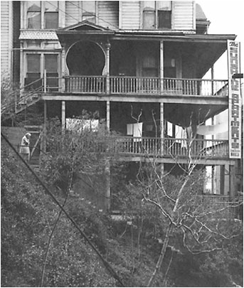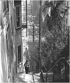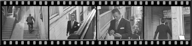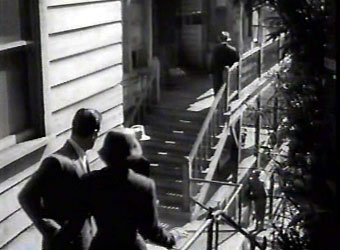 In 1955 director Robert Aldrich used the same stairs for a scene in Kiss Me Deadly. Altman, though uses composite shots. In this film sequence Ralph Meeker is seen starting up the stairs from Clay Street, but this is a different stairway located on the other side of the building. Meeker is then seen on the Third Street stairs where he climbs to the balcony of the the Hillcrest Hotel .