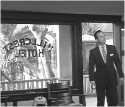 Altman seemed to be enamored with Bunker Hill staircases. In the top left scene Meeker enters the Hilllcrest Hotel after his climb of the Third Street stairs. He later has a fight and knocks a thug down the Second Street stairs. At the top right Meeker is looking for the room of Gaby Rodgers. In the lower right Rodgers descends another long staircase. Both scenes were filmed inside the Jalisco Hotel on Sixth Street.