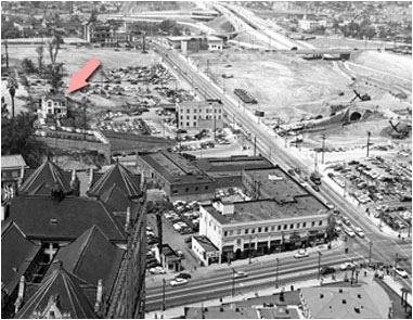 The same house in both photos taken in 1953. The house would soon be demolished as part of the Bunker Hill redevelopment project. The photo at the right was taken from City Hall and also shows the construction of the Hollywood Freeway that would cut through the heart of Bunker Hill.