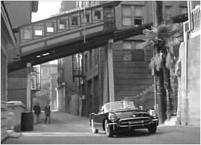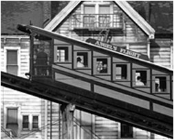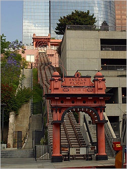 In 1901 a funicular railway was built to carry passengers from Bunker Hill to the burgeoning downtown area below. The funicular ran between Hill St. and Olive Street, a distance of some 300 feet. The railway was dubbed Angels Flight (no apostrophe) and was billed as the world’s shortest railway with a fare of five cents each way. It operated uninterrupted until 1969 when it was dismantled and the cars put into storage. In 1996 the railway was rebuilt a block away using the same cars and much of the original structure. However in its new life it serves more as a tourist attractions than a functional part of the City.