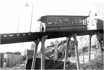 Right: In 1996 the remodeled cars were placed into service on new tracks a block from the original location. In 2001 a failure with the new haulage system caused the cars to break loose killing one passenger. Another haulage system was installed but continuing problems have forced intermittent shutdowns.