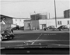 Filming any scenes in the downtown area proved difficult to avoid the looming gas tanks. Far left -