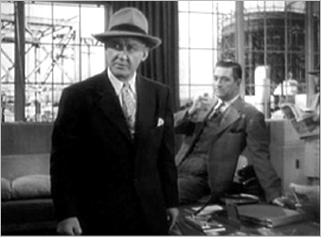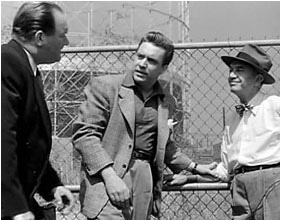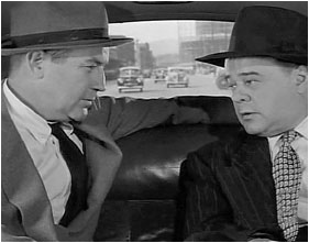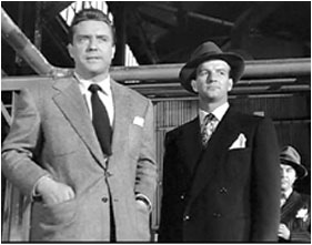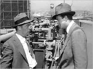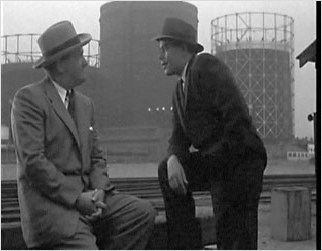 Glenn Ford and Barry Kelley talk as the gasworks loom in the background in The Undercover Man.