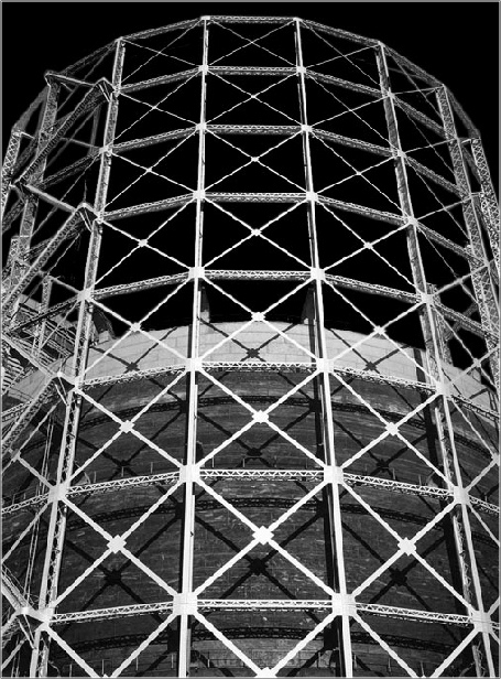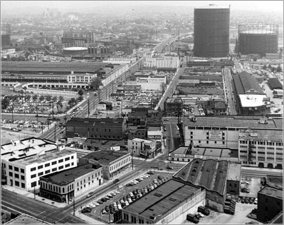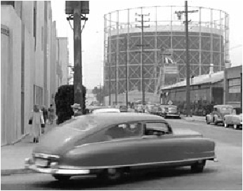 If you lived in Los Angeles in the 1950s you would be familiar with the two prominent features of the skyline (excepting the fact there was no skyline). The City Hall of course was the tallest building and the most identifiable but the other dominant structures were the storage tanks (also called gasometers) of the Los Angeles Gas Company. The L.A. Gas Company supplied natural gas to Southern California from a distribution center located just east of downtown. This was in an industrial area next to Union Station and became known as the gas works. The cluster of tanks and their steel skeletons were used effectively in film noir to provided an atmosphere of entrapment and gloom.