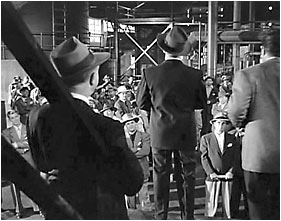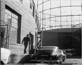 Cornel Wilde entering the gas works compressor building in The Big Combo.